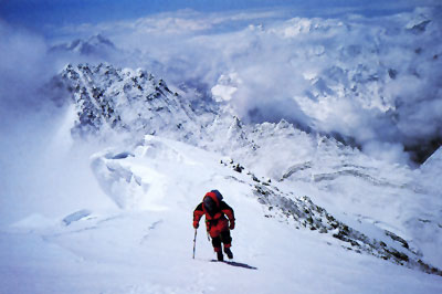 בחצות נראה הערפל קל יותר והחלטנו לצאת לדרך. שעה אחר כך זזנו. כל המאמץ, הסבל ואי הוודאות של החודשים האחרונים מתנקזים לעשר השעות הקרובות. נגיע לפסגה, או לא? שלוש וחצי בבוקר. פס אור חיוור משרטט בעדינות את קווי הרכסים במזרח. בשעתיים האחרונות התפזרו העננים והלילה התמלא באלפי כוכבים. לילה מושלם כפי שיכול להיות רק בהרים. עלינו בערך 300 מטר מעל האוכף הדרומי. אני עדיין חזק ואפילו מרגיש מדי פעם שהקצב איטי מדי. אסור לאבד אף שנייה. תמונת השלווה שסביבנו שבירה ביותר ויכולה להתנפץ לרסיסים כל רגע. כל טעות הכי קטנה, כל שינוי במזג האוויר – ואנחנו עלולים להישאר על האוורסט כפי שקרה ל-150 מטפסים שאיבדו כאן את חייהם. בארבע בדיוק הגענו לקו הרכס בגובה 8,400 מטר. בבת אחת נפתח בפנינו הנוף ויכולנו להתבונן צפונה לכיוון טיבט. ים של פסגות וקרחונים נעלם אל תוך המישורים הכהים של רמות טיבט. הרכס שעליו עמדנו המשיך בצורת בננה ארוכה עד לכיפת שלג מושלמת, הפסגה הדרומית. תשע וחצי בבוקר. עוד כמה צעדים זהירים ואני עומד על הפסגה הדרומית. 8,800 מטר, גבוה יותר מכל הר אחר בעולם, בסך הכל 74 מטר מתחת לפסגה הראשית. התמונה שהתגלתה לעיני באותם רגעים היתה מפחידה: רכס קרח משונן וחד כסכין הפריד בין שתי הפסגות. ובסופו – קיר סלע אנכי בגובה 15 מטר המכונה "מדרגת הילארי".