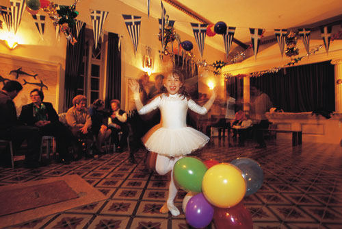 הקירות מעוטרים ציורי דולפינים בצבעי טורקיז, העתק של ציור הקיר המפורסם מהארמון המינואי בכרתים. לאורך קירות האולם, מתחת לחלונות המכוסים וילונות כבדים, פזורות כורסאות מיושנות, ועל הבמה המוגבהת בקצה מתנוססים כמה עמודים מתחת לגמלון משולש, שנראה כמו במקדש יווני עתיק.