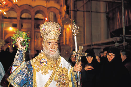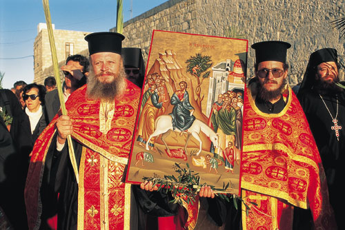 | "יום א' של הדקלים", שנחגג לזכר כניסתו של ישו לירושלים, הוא אחד הטקסים החשובים בכנסייה. כמרים יוונים-אורתודוקסים, יחד עם עולי רגל מיוון, אך גם מאוסטרליה, ניו זילנד, הונג קונג ועוד, צועדים עם ענפי דקלים בידיהם, ממזרח הר הזיתים, דרך שער האריות ועד לדרך הייסורים | צילום: יואב לף |