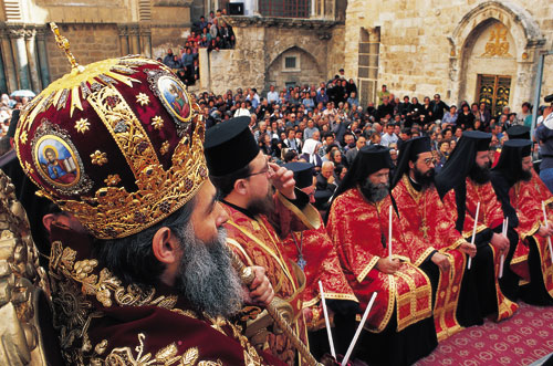 | בכירי כל הכנסיות הירושלמיות, יחד עם אלפי עולי רגל, מתכנסים מדי שנה בשבת הראשונה של הפסחא לטקס האש, המתקיים כבר יותר מאלף שנה. בשיא הטקס נכנס הפטריארך היווני-אורתודוקסי למבנה הקבר הקדוש כשבידו אבוקה כבויה. לאחר התפילה, יורדת אש מהשמים, כך מאמינים הנוכחים, ומדליקה את האבוקה | צילום: איתמר גרינברג |