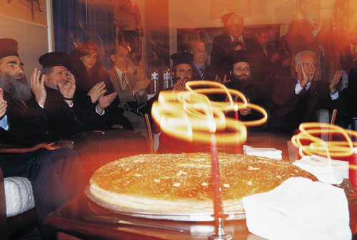 ראש השנה היוונית בירושלים. אורח הכבוד מתכבד בפריסת ה"וסילופיטה" – עוגה עגולה מקושטת, שבתוכה הוטמן מטבע. מי שימצא את המטבע יהיה בר מזל בשנה החדשה צילום: הראל סטנטון |