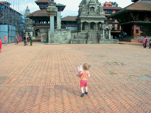 ליד הפארק הלאומי צ'יטוואן (Chitwan), באזור כפרי, טרופי יחסית, עשיר בשדות אורז ועני בכסף, זכינו – לראשונה – להיות מוזמנים אל תוך בתי החקלאים, לטייל בין החדרים, לראות את נפאל האמיתית: פוסטר של קוקה קולה תלוי על קיר חומר, חבל מתוח שעליו קולבים עם בגדים, מזרנים וערסלי שינה. הילדה, שאחרי שבוע כבר ידעה להגיד "נמסטה" (שלום) בליווי תנועת הידיים המתאימה, היתה פוגשת ילדים מקומיים על השביל הראשי, וממשיכה איתם (לא בלי לבדוק שאבא ואמא איתה), אל תוך החצרות הפנימיות. לרדוף אחרי תרנגולות. להסתכל לבאפלו בעיניים. להתהפנט על השלולית הגדולה שליד הבאר, שמתוכה מקרקרות במקהלה עשרות צפרדעים. זה הזמן להזכיר את השותף הרביעי למסענו — קלינטון, הכלבלב הוורוד של הקטנטונת. ואם נדייק – הכלבלב שהיה ורוד כשיצאנו לדרך. היצור הפרוותי ליווה אותה באש, במים ובבוץ, עד שהפך שחור לגמרי. מה שלא מנע ממנו לשמש לה גם כרית בלילה.