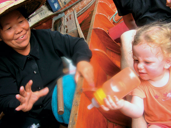 בתאילנד הטיול עם תינוקות פשוט בהרבה. חיתולים, דייסות, מוצצים, מרפאות – הכל זמין ונוח, והתאילנדים אוהבים ילדים עד הגג. הילדה רצה לכיוון לא רצוי? שלושה עוברי אורח יקפצו לאבטח. הילדה משתעממת בקניון? כל גדוד המוכרות יתקבץ סביבה וישיר לה שירים. למעשה, ברגע זה ממש מסתובבים בעולם כאלפיים תאילנדים כשתמונתה של בתי הבכורה מתנוססת בטלפון הנייד שלהם.