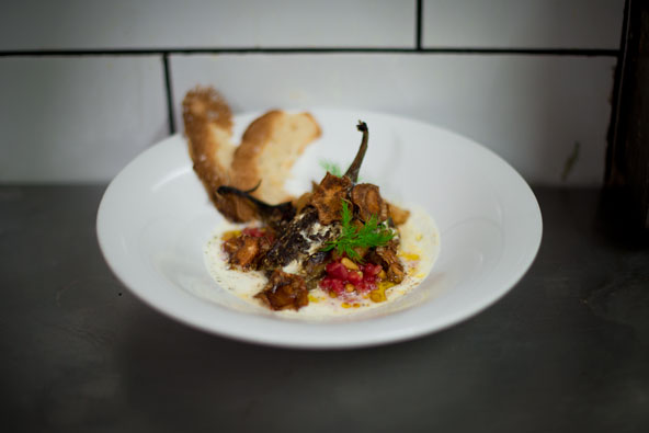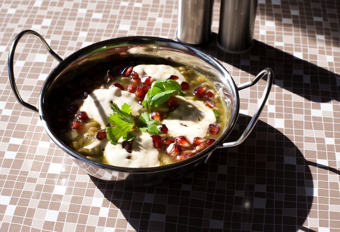 המסעדה שוכנת במיקום בלתי צפוי, הרחק ממעוזן של מסעדות ערביות ומזרחיות. מועין חלאבי מגדיר את המסעדה כמסעדה לבנטינית ומאמין שלאוכל אין גבולות פוליטיים. רולא, אשתו, המארחת במסעדה, היא הצלע הנוצרית בזוגיות. מועין הוא בשלן מופלא, שעשה דרך ארוכה עד שמצא את אושרו במטבח. "עד גיל 24 הייתי צמחוני, לא אהבתי מוצרי בשר וחלב. לא אהבתי את האוכל הצבאי ולכן התחלתי לבשל בעצמי", הוא מספר. מועין היה סטודנט בתוכנית "אלקנה"- תכנית לטיפוח מצוינות וסיים תואר שני במתמטיקה ובפילוסופיה. לפרנסתו עסק בפרסום אבל לא אהב את התחום. "הרגשתי שאני רוצה לעשות משהו בידיים ואהבתי לבשל. בחרתי להישאר נאמן לאוכל המסורתי עליו גדלנו רולא ואני". נאה דורש נאה מקיים: הוא מגיש מנות מפתיעות בטעמן המעודן. חומוס בעל מרקם קטיפתי קליל ומעט חמצמץ ועליו מוזלף שמן זית מהמטע המשפחתי בראמה, לבנה סמיכה וטעימה להפליא שמותירה בהפתעה סיומת של חריפות בגרון, סלט ג'רג'יר, ששמו השני הוא "טריות", וסמבוסק בגבינה עכואית שבצקו עתיר בזעתר בלי חשבון, תערובת שהיא אהבתו הגדולה של השף. עוד מנה משל מועין היא קובה אחמרה – קובה בגרסה טבעונית, המשמשת מתאבן שמקורו במטבח החלאבי . קובה בערבית פירושו "לכתוש". שורשיה של המנה בארבעים ימי הצום הנוצרי לפני חג הפסחא, כשלכל מאכל בשרי נוצרה גרסה טבעונית. המנה מגיעה בתוספת סלט זעתר עם רכז רימונים חמצמץ.