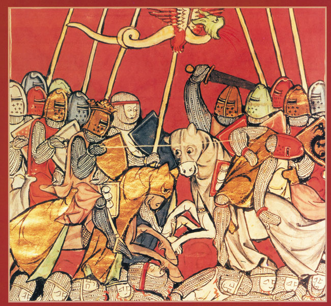 המלך ארתור בקרב ציור מתוך כתב יד מהמאה ה-14 |