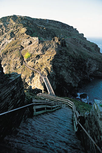 | טירת טינטג'ל. כאן, לפי המסורת, נולד המלך ארתור. יודעי דבר מצביעים על אחת המערות בסלע כמקום מגוריו של המכשף מרלין |