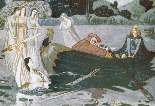 מרלין וארתור באגם שבו מעניקה גבירת האגם לארתור את אקסקליבר, החרב שתלווה אותו כל חייו. כשנפצע פצעי מוות, ביקש ארתור מאחד מאביריו להחזיר את החרב לאגם ציור: ג'ון מקירדיי דאנקן, 1963 |