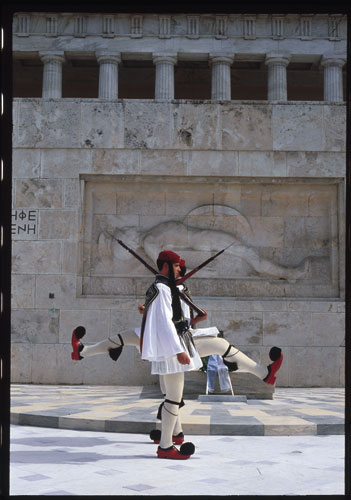 אבל לצילומים במקומות אחרים בעולם יש גם תפקיד משחרר: "המבט שלנו על המציאות בחו"ל הוא קרקסי, בגלל שהוא מבחוץ. תראי את החייל היווני בשקופית, שקופץ כמו ליצן. רק במבט שני מבחינים באנדרטת הזיכרון שמאחוריו".