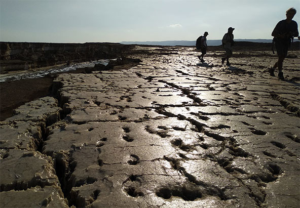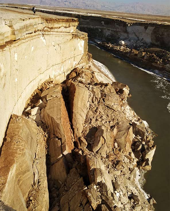 נכון. נחל הערבה זורם מדרום, מאזור הר שגוב בהרי אילת (כנחל חיון) ועד ים המלח. הוא נקרא נחל הערבה כי הוא חוצה את כל הערבה. צריך לזכור שהמקום הזה הוא לא סודי ולא נסתר, אלא ממי שזה נסתר מעיניו. מי שנורא רצה לראות אותו, הגיע לשם. למשל, אנשי המכון הגיאולוגי. אבל לא ידוע על חוקר שהלך לכל אורכו בעבר ותעד אותו, עד עכשיו. עיקר המחקרים שנעשו הגיעו לצד הצפוני, טיילו, חקרו, מדדו, מיפו, היו כאלה ששטו עם סירות לאורך הנחל, אחרים טסו עם מסוק וצילמו מעל, אבל לא היתה הבנה, שיש כאן מכלול נופי מיוחד במינו, והוא מחייב הגנה. והדבר הזה גרם לכך שהמקום נשאר שמור ולא ידוע, ונחשב "ליד הגבול", "משהו מרוחק". יש בדרך המון מוקשים, הרבה בוץ, גושים שקורסים, ועוד סכנות. ובעיקר – סיכויים גבוהים לעלות על מוקש. צריך להיות הכי מיומן שבעולם כדי לדרוך שם. ואין מה להיכנס לשם, רק לאחר שיוסדר שביל. ועל זה אני עובד.