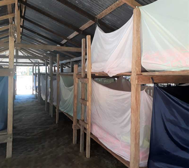 לעת ערב הגענו למחנה הראשון – מבנה בטון מקורה אך לגמרי פתוח. לרשות המטיילים עומדות כמה שורות של מיטות קומתיים המצוידות בכילות נגד יתושים, צפרדעים, חרקים ונחשים. וכשקמים בלילה לשירותים רצוי לוודא שבתוך הנעל לא מתחבא איזה נחש.