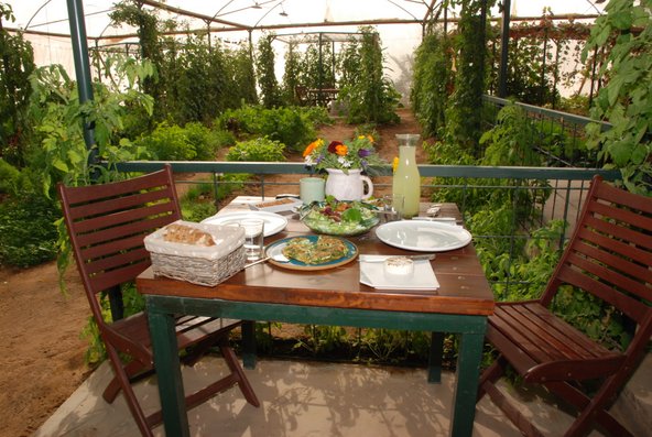 גן ירק בגינת הירק האורגנית של רונית ומוטי אלעזרי במושב צופר גדלים ירקות ועשבי תיבול נפלאים, כמו שרק בערבה יודעים לגדל. המבקרים משתתפים בקטיפת הירקות, ולאחר מכן הם מוצאים את דרכם לסלט ביחד עם הפרחים שגדלים בגינה. במקום מגישים ארוחות בוקר ובראנץ' אשר כוללות, בנוסף לסלטים הנפלאים, גם לחמים טריים, מאפים ביתיים ותה ריחני. יש גם פינת חי קטנה, מה שהופך אותו למושלם לארוחה משפחתית. איפה? מושב צופר טלפון: 052-3666819 שולחן מלא כל טוב בגן ירק | צילום: פרדי נפתלי