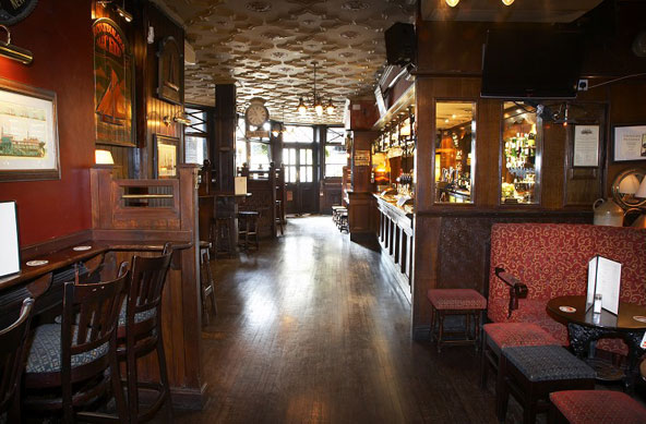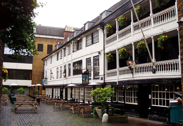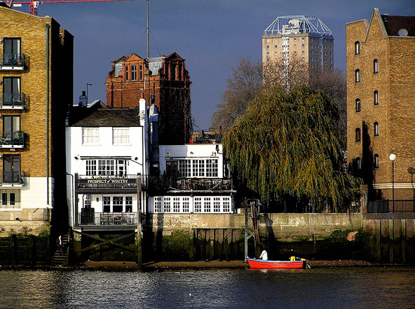Prospect Of Whitby ואם כבר פגשנו את הפאב ששוכן במבנה הכי עתיק ואת הפאב שמגיש אלכוהול הכי הרבה שנים, הרי ש- Prospect Of Whitby הוא הפאב הכי עתיק שפועל לגדות התמזה. הפאב הזה פועל מאז 1520, ונודע גם כ-Devil's Pub, בשל המוניטין המפוקפק שלו. פעם זה היה מקום מפגש למלחים, מבריחים למיניהם, גנבים ופיראטים, אבל ככל שחלפו השנים רשימת האורחים התחלפה וכללה אורחים מכובדים יותר, ובהם, איך לא, צ'רלס דיקנס. השילוט במקום מעיד על כך שבמאה העשרים גם ריצ'רד ברטון והנסיכה מרגרט נמנו על אורחי המקום. גם המבנה השתנה לא מעט עם השנים, במיוחד לאחר השריפה שפקדה את המקום בראשית המאה ה-19, ורק רצפת האבן נותרה כשהיתה.  Prospect Of Whitby במבנה הקטן הצבוע לבן. הפאב הכי ותיק על גדות התמזה