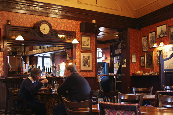 מאז עבר המקום לא מעט שינויים, שטחו הוכפל והיום מדובר בפאב לכל דבר ועניין. קירות המהגוני והציורים העתיקים שמעטרים אותם, הספרים, התאים הפרטיים, האח המבוערת – כל אלה תורמים לאווירה המיוחדת במקום. בנוסף לבר שמציע בירות מצוינות, חלקן ייחודיות למקום, יש פה גם אוכל טוב, שכולל מנות מסורתיות מהמטבח הבריטי ובהן סטייקים, צלעות ופאי. כתובת: 12 Gate Street The Spaniards Inn פאב היסטורי נוסף שפועל כבר למעלה מ-400 שנה באזור המפסטד הוא The Spaniards Inn שנוסד ב-1585. האגדה מספרת ששודד הדרכים דיק טרפין נמנה על יושביו הקבועים של הפאב, וכמותו שודדי דרכים נוספים שבחרו במקום הזה בשל האפשרות לתצפת ממנו היטב על הדרך, שבה עברו נוסעים אמידים. לפאב יש מקום של כבוד גם בספרות. צ'רלס דיקנס, כמה מפתיע, כתב עליו ב"רשומות מועדון הפיקוויקים", והוא הוזכר גם בספר דרקולה. חוץ מדיקנס, גם קיטס ושלי נהגו לפקוד את המקום.  ספרים בכריכת עור וחפצים עתיקים בפאב Spaniards Inn | צילום The Spaniards Inn ©