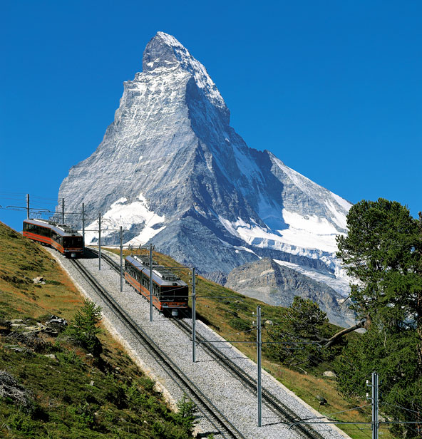 עם זאת, יש על ההר כמה מסלולי הליכה המתאימים לאוהבי לכת, שאינם מטפסי הרים מנוסים. דרך פחות מאתגרת (למרות שבהחלט לא מתאימה לסובלים מפחד גבהים) היא לקחת את הרכבל לקליין מטרהורן (Klein Matterhorn), בגובה של 3,883 מ'. מחלונותיו של הרכבל הגבוה ביותר באירופה נשקפת הפסגה הסימטרית של המטרהורן במלוא הדרה. תצפית נהדרת על ההר יש גם מהעיירה השוויצרית צרמט, השוכנת למרגלותיו, בגובה של 1,620 מ', ומי שרוצה לטפס לגבהים לתצפיות רחבות יותר, יכול לצאת מצרמט אל פסגות סמוכות. אחת התצפיות היפות על המטרהורן היא מפסגת הגורנגרט (Gornergrat), שההגעה אליה מהנה לא פחות מהשהות למעלה: מצרמט יוצאת רכבת הרים קטנה שמטפסת בתלילות רבה אל הפסגה, בגובה 3,089 מ', משם ביום בהיר יש ראות מושלמת של המטרהורן. תצפיות מוצלחות יש גם מפסגת רוטהורן (Rothorn) ומפסגת סונגה (Sunnegga), שאל שתיהן אפשר להגיע בקלות מצרמט. הרכבת הקטנה המטפסת אל פסגת הגורנגרט מאפשרת תצפית נפלאה על המטרהורן | צילום: swiss-image.ch/Toni Mohr
