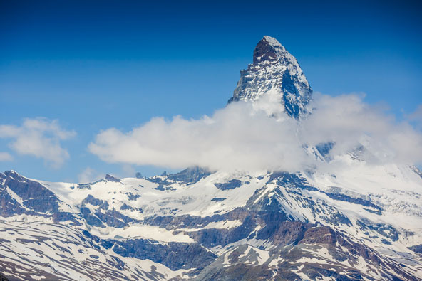 מטרהורן, שווייץ ואיטליה פסגתו המחודדת של המטרהורן (Matterhorn) היא אולי המוכרת ביותר בין פסגות האלפים. אחראים לכך הצורה החרוטית המושלמת, שקל לזהותה, וכמובן גם בזכות השוקולד השוויצרי המככב בחנויות דיוטי פרי, טובלרון, שמעוצב בדוגמת ההר. למרות שהפסגה מושלגת לאורך כל השנה, המדרונות תלולים מדי ועל כן לא הוקמו כאן אתרי סקי. ניסיונות לטפס אל ראש ההר החלו במחצית המאה ה-19 אבל הן הסתיימו באסונות, והפסגה נכבשה הרבה אחרי פסגות אחרות באירופה. גם כיום העלייה לפסגה מוגבלת למטפסים מקצוענים ובעלי ניסיון (אל תנסו להתחכם – בית הקברות של מטרהורן מלא בקבריהם של מטפסי הרים שנהרגו על ההר). פסגתו המחודדת של המטרהורן. למטפסי הרים מנוסים בלבד