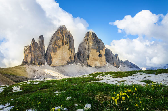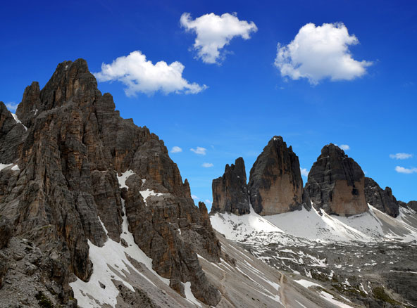 שלושת הפסגות של לאברדו, איטליה אם תתנו לילד בן שלוש לצייר הרים משוננים, סביר להניח שהתוצאה תידמה לשלושת הפסגות של לאברדו (Tre Cime di Lavaredo), שברכס הדולומיטים בצפון איטליה. אל השלישייה המרהיבה מצטרף הר פטרנו (Monte Paterno) הסמוך, שגם פסגתו משוננת באופן מעורר השתאות. ביחד הם יוצרים מחזה שהוא לא פחות ממדהים, שאי אפשר לשבוע ממנו. שלושת הפסגות של לאברדו