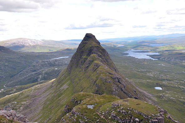 סוילבן, סקוטלנד ההר הגבוה ביותר בסקוטלנד, ובבריטניה כולה, הוא בן נביס (Ben Nevis), אבל הפסגה המרשימה ביותר לדעתנו שייכת לרכס סוילבן (Suilven) באזור ההיילנדס בצפון-מערב סקוטלנד. זוהי פסגה נמוכה למדי, ודאי במונחים של הרים אחרים ברשימה הזאת – 723 מ' גובהה בסך הכל, אבל צורתה המחודדת הבולטת מעל פני השטח מהפנטת. הוסיפו לכך את יופיו הלירי של האזור, הריק כמעט מתושבים והמנוקד באגמים רבים, ותבינו את סוד קסמה של הפסגה. אפשר לטפס אל הפסגה בשביל ארוך, בן 25 ק"מ, שמתחיל סמוך לכפר Lochinver ממערב להר וסופו מצריך עלייה תלולה ומאתגרת. אבל גם מסתפקים בהליכה בחלק קטן מהשביל, באזור שלמרגלות ההר, מראה הפסגה המחודדת והנוף הרומנטי המקיף אותה יפה להפליא. הפסגה המחודדת של הר סולילבן מוקפת בנוף רומנטי מנוקד באגמים