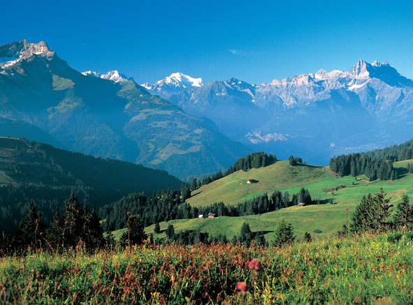 אל המלון הכפרי הקטן בדרום-מערב שווייץ הגענו בשעת ערב מאוחרת, בתום יום טיול גדוש, ומיד צנחנו למיטה. למחרת בבוקר ויצאתי למרפסת וצעקה לא רצונית החרידה את השלווה הכפרית: על רקע השמים הכחולים היו פרושות לפני, כמו במפה טופוגרפית, כמה מהפסגות המדהימות ביותר שראיתי בימי חיי. אחרי שהצלחתי להרגיע את הנשימה, התחלתי לזהות. הנה המון בלאן האדיר ובמה שנראה כמרחק נגיעה ממנו הזדקרה פסגתו המחודדת של המטרהורן וביניהן עוד כמה פסגות מרהיבות, כל אחת מדהימה מחברתה. זה לא שסלדתי מהרים לפני כן, נהפוך הוא, אבל זה היה רגע מכונן באהבה הענקית שלי להרים. את האהבה הזאת אפשר לספק בטיפוס מאתגר אל ראש ההר, אבל אני מעדיפה לפרנס אותה בדרכים אחרות, מאתגרות הרבה פחות. למשל, בישיבה נינוחה בבית קפה המשקיף אל ראשו של הר יפה במיוחד, או לחלופין – בבית קפה הנמצא על פסגה ומשקיף ממנה על הנוף מסביב. בין לבין, תמיד נעים לצאת לטיול קל בשבילי הרים, שאליהם מגיעים ברכבת או ברכבל. לטובת כל מי שאוהב נופים הרריים, הנה כמה מהפסגות הכי יפות באירופה ואיך אפשר ליהנות מהן מקרוב גם אם אינכם מטפסי הרים. הפסגות שנשקפו מחדר המלון שלי בכפר הררי בדרום-מערב שווייץ | צילום: swiss-image.ch/Lucia Degonda