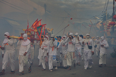 בסוף המאה הקודמת היגרו מאות אלפי סינים לתאילנד עקב לחץ כלכלי ופוליטי. הם הביאו איתם מסורות ומנהגים שבני תאילנד, באורח האופייני להם כל כך, ששו לאמץ. רבים מן המהגרים הסינים התיישבו גם בעיר פוקט (PHUKET) בדרום תאילנד. פעם בשנה, באמצע חודש אוקטובר, הם חורגים ממנהגם השליו ותוקעים יתדות, שיפודים, מזלגות וחפצים שונים בלחייהם ובעור גופם, יוצאים מכליהם בהתלהבות, ונוהרים אל הרחובות לחגוג את "הפסטיבל הצמחוני". אלפים מתושבי פוקט, כולם לבושי לבן, חלפו לנגד עיני ברחובה הראשי של העיר. הם פסעו לעבר המקדשים הבודהיסטיים כשבזרועותיהם מגשים עמוסי פירות. ברחובות ניצבו עשרות דוכני מזון מקושטים בדגלים צהובים ועליהם מזון צמחוני עשיר וצבעוני, מתנת נשות העיר למשתתפים בטקס ההיטהרות. הדגלים, עשן התבשילים והריחות האקזוטיים הזמינו את הצועדים לטעום מן המטעמים. מדי בוקר צעדו משתתפי הפסטיבל ברחובות העיר, לבושים בבגדים לבנים שהעידו שאינם אוכלים בשר. הם עברו בין המקדשים הפזורים בפוקט, כשלאורך מסלולם המתינו להם המוני אדם, לאורך חזיתות הבתים והחנויות, ולפני השולחנות העמוסים תקרובת, פירות ותה. המשתתפים עברו בקבוצות, נושאים על כתפיהם מיני מזבחים שונים, חלקם רצו או רקדו, וניכר בהם שהם שקועים בהתלהבות אדירה המביאה אותם אל סף אובדן החושים. ההמונים הטילו עליהם זיקוקים וחזיזים כדי לגרש את הרוחות הרעות וכדי להעביר את התפילות האנושיות אל האלים. כשהעשן הפך סמיך מדי נסו ההמונים מן הרחוב לרגעים אחדים, אך לאחר מכן חזרו וצבאו על משתתפי התהלוכה. המשתתפים עצמם הסתכנו ללא הרף, אטמו אוזניהם, והמשיכו לצעוד מבעד למסך החזיזים שהתפוצצו בין רגליהם ומעל לראשיהם.