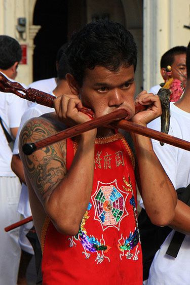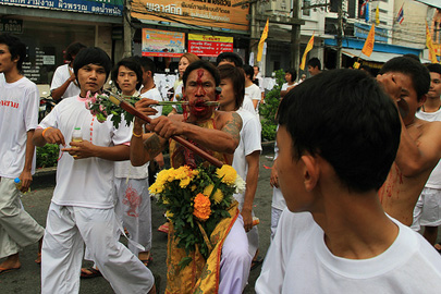 פעם בשנה, בחודש אוקטובר, חוגגים בעיר פוקט שבדרום תאילנד את הפסטיבל הצמחוני. המראות לא קלים לצפייה: המשתתפים צועדים ברחובות כשבלחייהם תקועים שיפודים, יתדות, סכינים, מוטות ומיני חפצים חדים אחרים. את שמו קיבל הפסטיבל מהמאכלים הצמחוניים שמטהרים את הגוף לקראת האירוע המרכזי פורסם 19.2.12 |