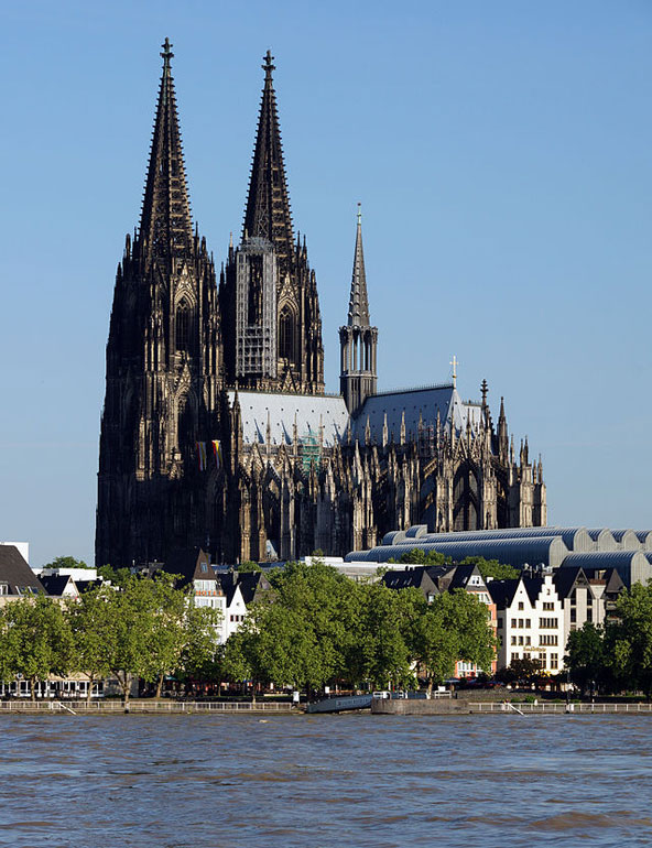 הקתדרלה של קלן קתדרלת קלן (Kölner Dom) חולשת על קו הרקיע של העיר ונחשבת לאחד המבנים המפורסמים בגרמניה. מגדליה, שמתנוססים לגובה של 157 מ', הקנו לה, למשך עשר שנים – בין 1880 ל-1890, את התואר הבניין הגבוה בעולם. בנייתה של הקתדרלה המהודרת החלה במאה ה-13 והסתיימה רק כעבור כ-500 שנה עם השלמת החזית, בסגנון ניאו-גותי שהקפיד לשמור על העיצוב המקורי, למרות השימוש בקורות פלדה מודרניות לתמיכת הגג. במהלך מלחמת העולם השנייה, בהפגזות על העיר קלן, ספגה הקתדרלה כמה פגיעות קשות, אולם המבנה עצמו נותר לעמוד ולא קרס. השיפוצים הסתיימו רק בשנות ה-80 וב-1996 היא הוכרזה כאתר מורשת עולמית. מיליוני תיירים פוקדים מדי שנה את הקתדרלה, שנותרה מרשימה כשהיתה, בין השאר בזכות ההגבלה על בניית גורדי שחקים בסביבתה.  הקתדרלה של קלן נחשבה במשך עשור במאה ה-19 למבנה הגבוה בעולם