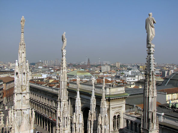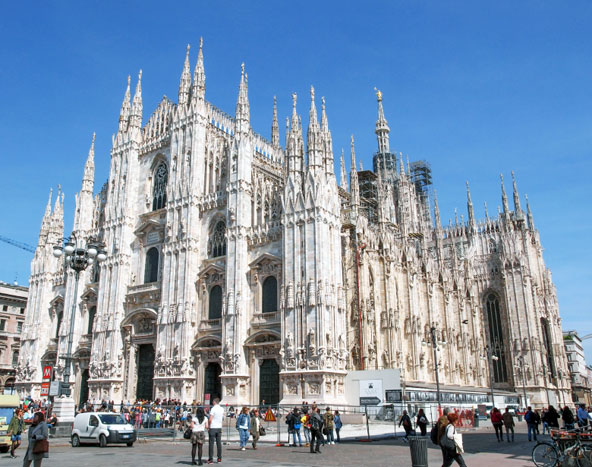 הדואומו, מילאנו הקתדרלה של מילאנו, הדואומו (Il Duomo), היא הקתדרלה הקתולית השנייה בגודלה בעולם, אחרי זו של סביליה, והיא יכולה להכיל לא פחות מ-40 אלף אנשים בעת ובעונה אחת. היא בנויה בסגנון גותי עשיר בקישוטים ובצריחים וצריחונים מחודדים, בסגנון המזכיר את האדריכלות הגותית הצרפתית יותר מאשר את זו שאפיינה את איטליה באותה תקופה. בנייתה של הקתדרלה החלה לקראת סוף המאה ה-14 ונמשכה מאות שנים, שבמהלכן הוספו לה אגפים שונים, הושלם עיצוב הפנים, נבנתה החזית המרשימה וכן הלאה. למעשה, רק במאה ה-20 הושלמה הבנייה סופית, עם חניכתו של השער האחרון ב-1965.  הדואומו – הקתדרלה של מילאנו. הבנייה החלה במאה ה-14 והסתיימה רק במאה ה-20
