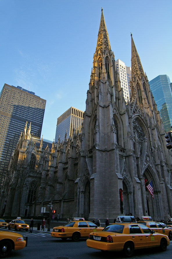 קתדרלת וסילי הקדוש בלילה. התאורה מאפשרת לראות פרטים שלא תמיד ברורים ביום קתדרלת סנט פטריק, ניו יורק לא רק באירופה יש קתדרלות גדולות ומרשימות, גם ארצות הברית מתהדרת בכמה שכאלה, ואחת היפות שבהן נמצאת בניו יורק. קתדרלת סנט פטריק (St. Patrick's Cathedarl), שנמצאת מול מרכז רוקפלר, היא הקתדרלה הניאו-גותית הקתולית הגדולה ביותר באמריקה הצפונית והיא בולטת שבעתיים על רקע גורדי השחקים המודרניים מסביבה. בשונה מקתדרלות אירופיות, שרבות מהן נבנו בימי הביניים, הקתדרלה של ניו יורק נבנתה במחצית השנייה של המאה ה-19, בהשראת הסגנון הגותי – מבחוץ היא מושפעת מהסגנון הגותי הצרפתי והגרמני, בפנים היא בנויה בסגנון גותי אנגלי. יש לה צריחים מרשימים, שמתנשאים לגובה מאה מטר וחלונות ויטראז' מרהיבים. בנוסף להיותה מקום קבורתם של הבישופים של ניו יורק, נערכו בה הלוויות של אישים מפורסמים, בהם הסנטור רוברט קנדי ושחקן הבייסבול האגדי בייב רות'.