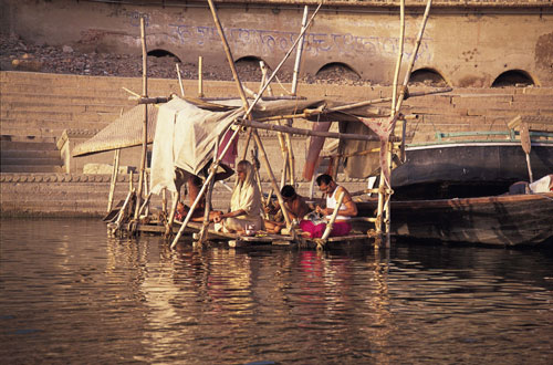 גם במדרגות העולות מהנהר שמעתי קול שירה: צליל ארוך אחד ואחריו דממה, שהביאה עימה צליל נוסף. עליתי לחפש את מקור הצליל. בסוכה ענקית ישבו על שטיחים מאות אנשים – גברים בבד לבן וחולצה ארוכה ונשים בסארי. על הבמה ישבו ברגליים משוכלות זמר, נגן טַבְּלה (תוף) ושתי נשים, שפרטו על כלי עץ ארוך, עם ארבעה מיתרים, שתחתיתו מעוגלת. מהכלי הופק צליל מונוטוני יחיד, מתמשך, שהיה הבסיס לשירת הזמר. מאוחר יותר התברר לי שזו טמפורה (tampura) – כלי נגינה עתיק הנותן את הצליל הבסיסי במוסיקה ההודית הקלאסית.