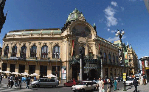 בית צהוב ומלון יפהפה ביציאה מהמנזר הולכים ברחוב אנז'סקה (Anezska) לכיכר השטלסקה (Hastalske), שבמרכזה כנסיית הקדוש קאסטולוס (Kostel Sv. Hastala), ועוקפים אותה מימין. הכנסייה היא מבנה גותי יפה, אם כי לא שמור. כדאי לשים לב לגדר הקטנה הצמודה למבנה, שמגינה על פסל של ישו המחופה בעצים. ממשיכים ברחוב ריבנה, מימין למלון סנטראל המכוער (בעוד כמה מטרים אפשר להשוות אותו למלון פריז האגדי), וחוצים את רחוב יקובסקבה (Jakubska). מימין נמצאים אחוריה של כנסיית יקוב הקדוש (Kostel sv. Jakuba), וממול, במרחק, נראים הצריחים הנפלאים של כנסיית טין (Kostel Panny Marie Bozi pred Tynem). במרכז הצומת הבא הביטו שמאלה, לעבר מלון פריז. זו אינה הכניסה הראשית אליו, אבל כאן התצפית היפה ביותר על הבניין. המלון הוא פנינה של הסגנון הניאו-גותי, ומשלב עיטורים של אר-נובו. ב-1984 הוא הוכרז כמונומנט היסטורי. פונים שמאלה לרחוב או אובֶּצ'נַיהוֹ דוֹמוּ (U Obecniho Dumo). ברחוב הזה נמצאת הכניסה למלון פריז, שהסופר הנפלא בוהומיל הראבאל הנציח אותו ברומן "שירתתי את מלך אנגליה". מסעדת המלון קרויה "מסעדת שרה ברנאר", לא רק משום שהגברת היתה פריזאית, אלא גם משום שהיתה אהובתו של צייר האר-נובו הצ'כי, אלפונס מוּחָה. בקצה הרחוב – כיכר הרפובליקה (Namesti Republiky), שהיא ממש תחנה מרכזית, ויש בה גם שוק. פונים ימינה, ומיד מגיעים להיכל העם (Obecni Dum).