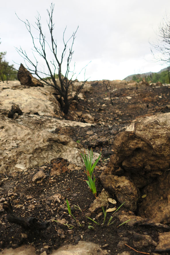 בין השטחים השחורים של החורש ניתן כבר לזהות קצוות ירוקים, מרימים ראש מעל פני האדמה, לוקחים אוויר לנשימה. גשמים כבר החלו לרדת, מעידים באמצעות צמחים שהחלו לנבוט, ובעיקר באמצעות אלו שלא, על הנזק האמתי שנגרם. השטח של הרי ירושלים חטף מכה קשה, 15,000 דונם של שטחים פתוחים, מתוכם 8,500 דונם של שמורת טבע נחל כפירה והשאר של גן לאומי הרי יהודה ויערות קק"ל. עצי הזית העתיקים שהיו בשמורה לא יחזרו וכעת לא נותר לעשות הרבה מלבד לתת לטבע לעשות את שלו.