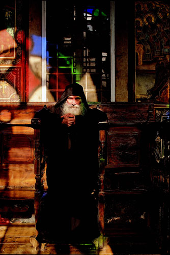 לאלכסנדר הגדול, ואפילו הגיש תוכנית, שלפיה תתנשא דמותו ההרואית של מלך מוקדון מאות מטרים מעל סביבתה, ומפל אדיר של מים ישפע ממנה; אבל אלכסנדר דחה את הרעיון. יוון הקלאסית לא התעניינה הרבה בתוספתן הנידח הזה (ובמדינת הנזירים, שכולה פיסת ביזנטיון משומרת, אין כמדומה זכר ליוון של הפרתנון ושל סוקראטס). במחזה "אגממנון", מזכיר אייסכילוס בשורה קצרה אחת את ההר "הקדוש לזאוס", וההיסטוריון הגדול הרודוטוס מספר על כסרכסס (הוא כנראה המלך אחשוורוש מהמגילה), שכרה תעלה (או אולי רק חשב לכרות אותה, ואולי אפילו זה לא) במקום הצר ביותר (פחות משלושה קילומטרים) של לשון היבשה הזאת. הוא שלח אז, בשנת 480 לפני הספירה, צי גדול לכבוש את יוון וחשש שמא יעלה בגורלו מה שקרה לצי של אביו דריווש, שבניסיון לעקוף את חצי־האי התרסק אל הצוקים התלולים של אתוס (Athos). השיט בין מנזרי החוף הוא גם היום עניין של מזל (בפעם הקודמת שביקרתי באתוס היה לי, וראיתי את מנזר סימונופטרה המרשים מאוד מצידו היפה ביותר; הפעם לא). כשהים רוגש, גם כשהוא נראה כמעט שקט בעיני עכבר יבשה, הסירות הקטנות אינן באות, וצריך ללכת ברגל בשביל הצר העולה ויורד במדרון התלול. כשהוא רוגש קצת יותר, גם המעבורות (אחת ליום מאורנופוליס, בחוף הדרומי, כמה קילומטרים מזרחה מהמקום שבו עברה, אולי, התעלה של אחשוורוש, ואחת ליומיים מיריסוס שבחוף צפוני) אינן מעיזות לצאת. המעבורות האלה הן הקשר היחיד בין יוון, רפובליקה טרייה למדי וחברה באיחוד האירופי, לבין "ההר הקדוש" (למריה, אמו של ישו; לא לזאוס), אוטונומיה בת כ־1,100 שנים המשתרעת על פני חלקה הגדול של לשון היבשה. יש, כמובן, קשר יבשתי בין המדינה החילונית לאוטונומיה הקדושה הכפופה לה, אבל הכביש נגמר באורנופוליס הסמוכה לגבול, ולפחות רשמית אין מעבר להולכי רגל. סידני לוך, סקוטי שגר בשנות החמישים ליד הגבול, ואשר ספרו "אתוס, ההר הקדוש" הוא עדות מרתקת של לא־מאמין על חיי הנזירים, חצה לא פעם את הגבול ברגל; אבל בחלק המערבי של האוטונומיה אין כמעט תושבים וגם הנוף מעניין פחות. ה"אקשן" מתחיל כעשרה קילומטרים ממזרח לגבול, במנזר הסרבי היפה מאוד, כיליאנדרי, אחד מ־20 המנזרים הגדולים השולטים בהר הקדוש, והתנועה לאתוס וממנה – של הנזירים והפועלים והצליינים והמטיילים והתיירים – מתנהלת כולה במעבורות. גם פטרוס איש אתוס – שאיתו מתחילה ההיסטוריה הכמעט־ממשית של ההר הקדוש, כ־1,200 שנים והרבה ממלכות אחרי אלכסנדר – הגיע לכאן באונייה, וזו נעצרה לפתע, למרות שהרוח נשבה והים המה. ואז אמר הקדוש לאנשים: "אות הוא!" ושאל אותם מה המקום הזה, והם אמרו לו, והוא הבין שזה ההר שעליו דיברה אם האלוהים כשהופיעה בחלומו וסיפרה לו על ההר היפה, שאותו בחרה מכל המקומות בעולם להיות לה לגן, ושבו היא עצמה תהיה מורה ורופאה ואחות לכל מי שיבחר לגור שם; והוא עלה לחוף ומצא לעצמו מערה, ונלחם בחיות טרף ואכל עשבים, וייסד את המסורת האחת מהשתיים שמתקיימות באי עד היום, זו של המתבודדים (השנייה, זו של הנזירים החיים חיי פרישות קולקטיביים, התחילה בערך באותו זמן). באמצע המאה העשירית ייסד אתנסיוס הקדוש את העתיק במנזרים שקיימים עד היום, מֶגִיסְטִי לַאוְורָה, ובזכות ידידותו עם הקיסר הביזנטי ששלט אז קיבל צו קיסרי שהבטיח  | | מרפקי הנזירים שעונים בתפילות הארוכות על מסעדי הכיסאות הגבוהים, ידיהם אסופות לפני החזה כמו כנפיים ודומה שמצבם הטבעי הוא בין ערות לשינה |