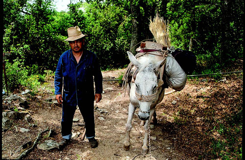 את מעמד ההר הקדוש כטריטוריה עצמאית של נזירים ומתבודדים (גברים בלבד) בחסותו הישירה של הקיסר. והוא נשאר כך מאז, למרות תהפוכות השלטון סביבו, והעליות והמורדות במספר הנזירים ובעושרם (באמצע המאה ה־17 היו בהר כ־4,000 נזירים, בראשית המאה כ־7,500, לפני 30 שנה פחות מ־1,500 והיום בערך 1,700), למרות כמעט 500 שנה של שלטון תורכי ומשנת 1912 של המדינה היוונית. מבודד גיאוגרפית – יובל צדדי של מה שאולי היה פעם תרבות גדולה, שההיסטוריה פחות או יותר פסחה עליה (או לפחות הנראטיב המערבי המרכזי, מיוון הקלאסית דרך רומא וקרל הגדול אל הרנסאנס והעת החדשה, שמשמש עדיין את רובנו) – "ההר הקדוש" שומר אפילו על מניין השנים והימים שהיה נהוג בקונסטנטינופוליס: הלוח היוליאני – המפגר ב־13 ימים אחרי רוב העולם, כולל יוון – וימים שמתחילים, כמו ביהדות, בשקיעה. כששמענו את הסמנטרון – לוח העץ הצר שעליו מקישים כדי לקרוא לתפילות – בשעה שלוש לפי שעוננו וגם לפי שעון יוון, הוא קרא לתפילת בוקר (היינו שם במאי, והשעה המקומית היתה שש, אם כי כל שעוני הקיר שראינו עמדו). ביקרתי בהר 19 שנים לפני כן, בסתיו. ההרגשה של חזרה בזמן היתה אז חזקה הרבה יותר. פרט לאוטובוס מהנמל לבירת האוטונומיה, קארייס – שבה יושבים נציגיהם של 20 המנזרים הגדולים ומנהלים את ענייני האי, וגם נציגי הממשלה היוונית האחראיים לביטחון – לא היו מכוניות כלל, ועל הרשיון המאפשר לנושאו להסתובב בחצי־האי במשך ארבעה ימים ולהתארח חינם במנזרים היתה חותמת גדולה עם התאריך היוליאני. את הרשיון קיבלו אז ארבעה תיירים ביום, ומיד. היום מקבלים עשרה ביום, והתור ארוך. כשבאנו לאורנופוליס במאי השנה היום היה יפה והים שקט. זוגות טיילו לאורך הטיילת, ונשים נפרדו מבעליהן לארבעה ימים או עלו על ספינת תיירים לסיור תצפית סביב ההר הקדוש, שאליו אסור להן לבוא. המעבורת שהחליפה את הסירה של אז היתה מלאה מכוניות (רק של נזירים ושל אנשים שעובדים בהר), ומטיילים ירוקים עם נעלי הרים ומקלות הליכה (בפעם הקודמת ראיתי רק שני אנשים שבאו לטפס על ההר, אב ובנו שהלכו בנעליים חצאיות חום־לבן עם חורים, במכנסי גברדין ועם מזוודת קרטון גדולה וחומה קשורה בחבל; מה שלא הפריע להם להגיע לפסגה) וגם מעט צליינים. בעשור האחרון, וביתר שאת מאז שהחליטה הקהילה האירופית לעשות מאמצים לשימור המנזרים ואוצרות האמנות הרבים שהלכו והתמקמקו במשך השנים, מורגשת באתוס תנופת פיתוח. בקארייס אפשר למצוא היום ג'יפים לכל המנזרים הגדולים, ורק לכמה מכפרי הנזירים (הקרויים סקיטי וכפופים למנזרים הגדולים) וכמובן למערות של המתבודדים המוזרים יותר, עוד צריך ללכת ברגל או לרכוב על פרד. פרד הוא בעל החיים המבוית היחיד שמותר להחזיק באתוס, מה שמסביר את הצמחייה  | | פרד הוא בעל החיים המבוית היחיד שמותר להחזיק באתוס, מה שמסביר את הצמחייה הנפלאה. אין כאן עזים וכבשים להשחית אותה כמו בחלקים אחרים של יוון |