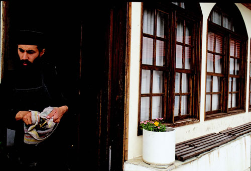התלול ורצוף האבנים שיורד מהר אתוס, ואשר מחצרו נשקף נוף ים מפואר – הוא מכפרי הנזירים היותר עשירים ודומה מעט למושב שיתופי, שכן הוא מתיר לחבריו לאכול בבתיהם ולהחזיק מעט רכוש פרטי – משטר שנקרא "אידיוריתמי". זאת, בניגוד למנזרים הגדולים – 20 במספר על פי חוק ישן, מהם 17 יווניים ושלושה שייכים לנוצרים אורתודוקסים אחרים, אחד סרבי, אחד רוסי ואחד בולגרי (לרומנים יש רק סקיטי) – שכולם "קינוביטיים", כלומר מאורגנים כמו קיבוצים של פעם (שפע האיקונות, חפצי האמנות, הכתבים המאוירים וציורי הקיר שיש בכמה מהם – ואטופדי, איווירון וכיליאנדרי, למשל – מעידים על עושר הקשור, לדעת ביירון, בעובדה שכולם היו אידיוריתמיים. היום, כאמור, כבר אינם כאלה). מנזר קראקאלו, הראשון שבו ישנתי באתוס ושאני זוכר אותו משום כך בחיבה למרות השנים שחלפו, הוא מנזר קינוביטי כבר כמעט מאתיים שנה; ולמרות שיש בו שרידים מעניינים (בהם רסיס של הצלב המקורי), כתבים וחפצי אמנות, מה שבלט בו בעיקר הוא צניעותו ופשטות הליכותיהם של קומץ הנזירים הישישים. הוא נמצא במרחק הליכה נעימה מקארייס, ועלינו אליו אחרי רחצה מפוארת בים של אוקטובר, כחול מאוד ולא קר מדי. היינו שני ישראלים בלי אף מלה יוונית, והנזיר המארח (בכל מנזר יש כזה, וצריך להקפיד להיכנס בשערי המנזרים לפני רדת החשיכה) לא ידע אלא יוונית; אבל הוא הושיב אותנו לנוח ונתן לנו ראקי (קצת כמו אוזו, אבל חלש ומתוק ממנו) ומים, וקפה ורחת לוקום. כמו בכל מנזר, גם היום, רק איכות הראקי משתנה, ואת הגרוע ביותר – לטענת מומחה גרמני ליינות שבא לאתוס מדי שנה – מגישים במנזר העתיק והמכובד ביותר, מגיסטי לאוורה, שם העברנו איתו, הצלם שמעון לב ואני, לילה של נחירות בחדר קטן ומחניק. אכלנו עם הנזירים דייסה של ערמונים מבושלים ועוד משהו מחצילים או קישואים. איני זוכר מהאוכל אלא את תפלותו. הצמחונות אינה חובה אמנם, פרט לימי הצום המרובים, אבל מאז שסילקו מההר את הרועים הוולאכים אין מי שיספק חלב או בשר, וגם תרנגולות אסור, אז הנזירים אוכלים בעיקר ירקות מבושלים ולפעמים דגים, ושותים יין תוצרת בית, שנע בין הגרוע למדי לבלתי שתי. נוראות האוכל באתוס (כמעט תמיד) הוא עניין ידוע: "לעיתים מקבל הנוסע צלחת של שעועית קרה ודביקה בתור מנחתו האחת של הנזיר המארח, וכשזה קורה בשניים או שלושה מנזרים בזה אחר זה, כמו למשל בזמן צום, הוא בורח בדרך כלל מן ההר ומזכיר את סבלותיו בספרים ובהרצאות שנולדו מהנסיעה", כתב סידני לוך. אין ספק, מסכים הנזיר אלכסנדר (גוליצין) – אמריקאי, שספרו "העד החי של ההר הקדוש" כולל מסמכים מההיסטוריה של ההר ועדויות של אנשי אתוס בני זמננו – אבל מי שבא ממדינות עשירות יותר צריך לזכור שהדבר אינו שונה מאוד מהאוכל הרגיל של מרבית הכפריים (וביוון, אם יורשה לי לפגוע ברבים, האוכל בכלל לא מלהיב). השינה, לעומת זאת, היתה נפלאה. כיוון שלא היו אורחים אחרים במנזר, קיבלנו חדר גדול וריק. האוויר הצח הרדים אותנו עד מהרה, ואת השקט הכבד אפשר היה לחוש באצבעות. ישנו איזה עשר שעות באותו לילה, וגם הסמנטרון שקרא לתפילת הלילה (בוקר) לא העיר אותנו.  |  | מנזרמגיסטי לאוורה, העתיק במנזרים שקיימים עד היום. במאה העשירית הובטח מעמדו של ההר הקדוש כטריטוריה עצמאית, והוא נשאר כך מאז, למרות תהפוכות השלטון סביבו | הנזיר אליאס ממנזר כלילאנדרי, אחד מ- 20 המנזרים הגדולים השולטים בהר הקדוש. " יש הרבה צעירים ומשכילים שנמאס להם מהעולם, והם באים לחיות חיי רוח באתוס", טוען אחד הנזירים |