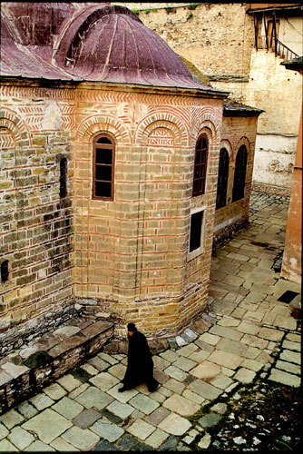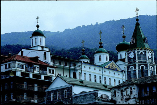 "כמה שעות צריך נזיר לישון, אבי?" שאל נזיר צעיר את האב נ', שהיה אז בן 86 (אני מצטט מהספר של גוליצין). וזה עונה לו, שתיאודור הקדוש וסימיון הקדוש סברו שדי בארבע או חמש שעות, אבל האב ארסניוס טוען ששעה אחת מספיקה לנזיר, אם הוא אכן לוחם רוחני, ואילו אקאקיוס הקדוש הסתפק בחצי שעה. "ומה איתך?" שואל הצעיר. "אתה באמת מוכרח לשאול?" "כן, תגיד לי, למען ישו". "טוב, אני אגיד לך, ארבעים וחמש דקות עד שעה". "וזה מספיק לך?" "או! זה הרבה!" "והכל בבת אחת, או בהפסקות?" "בהפסקות כמובן, בהפסקות. רבע שעה פה, רבע שעה שם…" "אז מה אתה עושה כל הזמן?" "עכשיו, שיש לי שבר כפול, אני כבר לא יכול לעמוד לצערי, אז אני יושב וקורא את ספר תהילים ואת הברית החדשה, ואז אני חוזר במשך זמן־מה על תפילת ישו [האדון ישו המשיח רחם עלי החוטא]". "כל תהילים וכל הברית החדשה?" "הכל, כמובן הכל". "כל יום?" "כל יום, אבל עכשיו אני כבר לא יכול לקרוא בעמידה. מה אפשר לעשות? ככה זה כשמזדקנים". בעניין השינה אני לא יודע, כמובן, אבל כל היתר דומה להפליא למה שכל מבקר יכול לראות בכל מנזר. הנזירים הקינוביטיים (לפחות הבכירים; המתלמדים חייבים בעבודות המעטות של המשק) מתפללים כחמש־שש שעות בלילה ושלוש־ארבע אחר הצהריים (ביום חול; בחגים יש הרבה יותר), ואוכלים שתי ארוחות (בשתיקה, פרט לקול המונוטוני של נזיר שקורא מ"חיי הקדושים" או סיפורי צדיקים), וחוץ מזה הם ישנים (או לא), לפעמים בחדריהם, לפעמים בישיבה על אבן בחצר. לא ראיתי נזיר עובד בחלקת הירקות (והגן של מגיסטי לאוורה, למשל, הוא חרפה לכל גנן חובב), ולא ראיתי נזיר קורא ספר (הם גם לא קוראים עיתונים ולא יודעים על העולם אלא מה שהם שומעים ממבקרים או בשיחות טלפון. היום יש בכל מנזר טלפון עם כרטיס). דומה שהמצב הטבעי שלהם הוא מצב ביניים בין ערוּת לשינה, כפי שבתפילות הארוכות הם חצי יושבים חצי עומדים, מרפקיהם שעונים על מסעדי הכיסאות הגבוהים והצרים, עם מושב מתרומם כמו בקולנוע, ידיהם אסופות לפני החזה כמו כנפיים, עיניהם נעצמות ונפקחות לפרקים, מקשיבים (או לא) למנהל התפילה הקורא מהספר (כמה מהם אפילו לא מבינים את שפת התפילה, אמר לנו אינטלקטואל מבלגרד ואיש העולם לשעבר, שעובד היום כנהג בכיליאנדרי מסיבות השמורות איתו ואיתי), לפעמים קמים, עושים סיבוב, נעצרים לנשק איקונין, מצטלבים, יוצאים וחוזרים ונכנסים. "היום זה לא כמו מה שאתה זוכר מלפני 20 שנה", אמרו לי רבים, בהם האב דימיטריוס שגר פעם באתוס והיום הוא בירושלים, איש עגול ומרוצה מחייו שישב מאחורינו במטוס לאתונה. "יש הרבה צעירים ומשכילים שנמאס להם מהעולם, והם באים לחיות חיי רוח באתוס". אולי. ללא ספק ראיתי הפעם הרבה יותר צעירים, ובוודאי לא כולם בורים; כך, למשל, האב ושני בניו | | המנזר הרוסי, איוס פנדלמונוס. על פי חוק ישן, יש באתוס 20 מנזרים, מהם 17 יווניים, אחד סרבי, אחד רוסי ואחד בולגרי. לרומנים יש רק סקיטי, כפר בחסות המנזר |