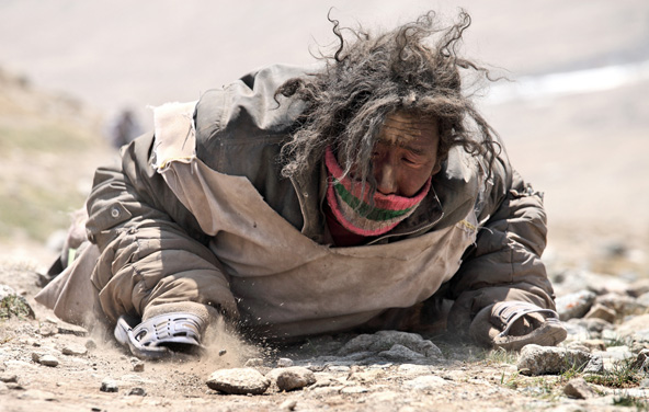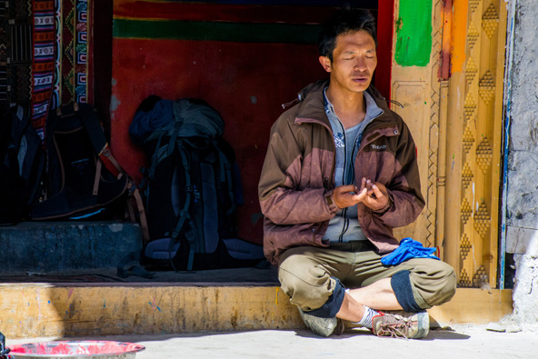 על השביל שעלה מדרצ'ן הופיע פתאום טיבטי צעיר. הוא צעד במהירות גדולה, וכשהגיע אל ה'צורטן התעלם מאיתנו והחל לבצע את שבע ההקפות סביב המבנה הקדוש. תוך כדי ההקפות מלמל שוב ושוב "הו, התכשיט שבפרח הלוטוס" והשליך לאוויר פתקאות קטנות שעליהן נרשמה המנטרה. לאחר שסיים את ההקפות, המשיך בדרכו. זוהי ההקפה ה-102 שלו סביב ההר. עוד חמש הקפות הוא ישלים את 107 ההקפות שישחררו אותו מלהמשיך להתגלגל בלידות הבאות לעולם הזה ולסבלותיו. ההקפות הרבות הללו, כך הוא מאמין, יביאו אותו להארה דרך הרגלים.