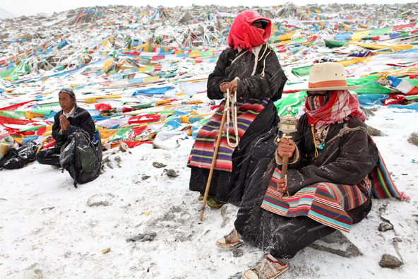 בבוקר התחלנו לטפס על ההר. במשך שעה וחצי התקדמנו על אותו קו גובה לכיוון מערב, אל פתחו של עמק נהר הלה צ'ו (LHA CHU), שמנקז את זרמי המים היורדים על צדו הדרומי של ההר. בפתח עמק הנהר עמד צ'ורטן (אתר דתי בודהיסטי) גדול מוקף מעגל של דגלי תפילה. סביב הצ'ורטן עמדה קבוצת מאמינים הינדואים שהגיעו ממומביי. שניים מהם, בנקאי וחייט, רקדו סביב הדגלים ושרו שירי הלל לשיווה. איתם היתה גם אישה מבוגרת, אף היא ממומביי, שסיפרה לנו כי היא בת לדת פרסית. לפי האמונה זו, האדמה האש והמים הם הקדושים, ולכן אין לקבור או לשרוף את המתים, אלא להשאירם לאוכלי הנבלות ולעופות הטרף על ראשי מגדלים או בהרים. היא הצביעה על מדרגת סלע גבוהה לא הרחק מאיתנו, וסיפרה כי זהו המקום בו מעדיפים בני הכת למות. הטיבטים מספרים שבאזור יש ריכוז גדול מאוד של בעלי חיים ועופות תאבי בשר: נשרים, שועלים, זאבים, וכלבים.