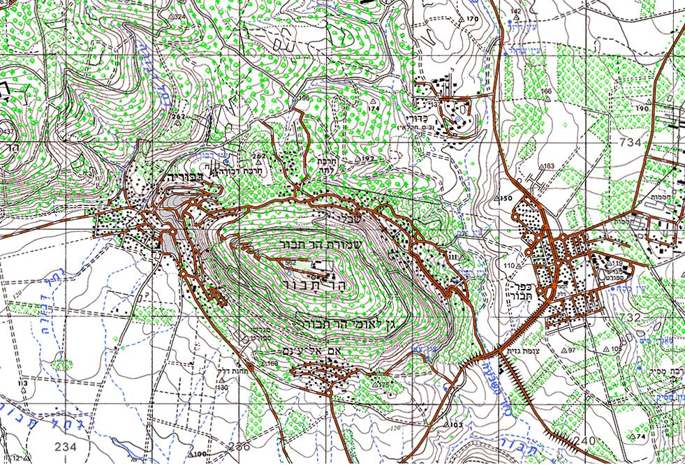 אבל תאמינו לי, שכל אלה, דברים נפלאים ככל שיהיו, אינם הסיבה האמיתית לעלייה להר. הסיבה היא כמובן נקודות התצפית הטובות ביותר בצפון הארץ, למעט פסגת הר מירון והחרמון. ממרפסת תצפית הצמודה לאגף הדרומי רואים את כל צפון השומרון ומרכזו, את הגלבוע, את העמק ואת הכרמל. ממשטח שנמצא משמאל לאפסיס החיצוני של כנסיית ההשתנות, באזור בסיס המגדלים האיובים האדירים, רואים את כל רמות הבזלת של מזרח הגליל התחתון, את עמק הכנרת, את הגולן ואת הרי גלעד. ואם טרם קבלתם סחרחורת מגודש המראות, רדו בכביש הצר מכנסיית ההשתנות, דרך שער הרוחות, עד לפיתול העליון בכביש שעולה לפסגה. משם אפשר לראות את כל הגליל התחתון, את כל הגליל העליון, את החרמון ואף את הר הלבנון. מי שמעוניין רק בסיפורי הקודש, שייקח בחשבון, ששעות הפתיחה והסגירה של הכנסיות אינן מסבירות פנים למבקרים ובשבתות בכלל סגור. כדאי לפיכך לברר בלשכת התיירות הממשלתית מהן השעות המדויקות לכניסה ביום בו אתם מחליטים להגיע לכאן. איך מגיעים? עוד בסביבה למיטבי לכת מפה טופוגרפית של הר תבור וסביבתו צילום תמונה עליונה: ניל מרסר, אייסטוק |