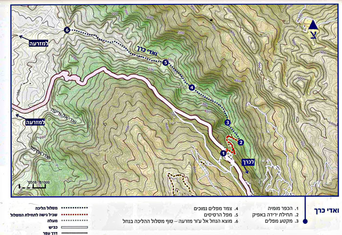 מידע מעשי דרכי הגעה ויציאה: תחילתו של מסלול הירידה בוואדי כרך היא בכפר מומיה, הסמוך לכרך. אל הכפר ניתן להגיע מכביש כרך – ים המלח. מסלול הירידה בוואדי כרך מסתיים בכביש הנמשך מהכפר ע'ור מזרעה ומזרחה אל מתקן איסוף המים שבמוצא הנחל אל הע'ור. ניתן לתאם איסוף מנקודה זו או להתקדם בהליכה ארוכה עד לכפר. אורך הטיול: מסלול הירידה מהכפר מומיה ועד נקודת הסיום אורך כשמונה שעות. עונה מומלצת: ניתן לרדת בנחל בכל עונות השנה. בחורף מתחזקת מאוד עוצמת המים והגלישה במפלי הנחל מחייבת הרטבת הציוד. שימו לב! את מפלי הנחל העליונים, המחייבים ירידה בגלישה, ניתן לרדת יחד או בנפרד. במצב בו יורדים כל מפל בנפרד יש לבדוק כי קיימים עיגונים בראש המפל הבא לפני משיכת הגולש האחרון. ציוד: 110 מ' חבל במידה שגולשים את מפלי הנחל העליונים כמפל אחד (גובה כולל כ-50 מ'). אם יורדים את המפלים בנפרד ניתן להצטייד ב-60 מ' בלבד (גובה המפל הגבוה ביותר 25 מ').  מוצא הנחל אל בקעת ים המלח דרך צלעות הגיר האדירות התוחמות את קצה הנחל. החקלאות במוצא הנחל מנצלת את מימיו להשקיה | צילום: בועז לנגפורד