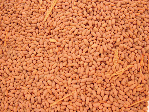 אחרי הפרדה בין זכרים לנקבות, הגלמים הזכריים (שצבעם הטבעי חום) נצבעים באדום פלואורסצנטי וסופגים קרינת גמא רדיואקטיבית שמעקרת אותם |