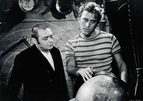 | קירק דאגלס ופיטר לורה בעת צילומי הסרט "עשרים אלף מיל מתחת למים" (1954). גיבור הספר, קפטן נמו, מפקד הצוללת נאוטילוס, היה לדמות מוכרת כמעט בכל בית בעולם המערבי |