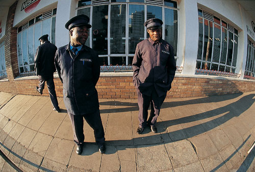 שומרים פרטיים בכניסה לחנות בהרארה. בגל הפשע הגואה מוצבים שוטרים ושומרים ליד כל חנות וכספומט |