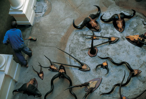 בולוואי קלאב. ניקוי מזכרות ציד שתלו חברי המועדון הגאים. בתום הניקוי יתלו אותן שוב על הקירות |