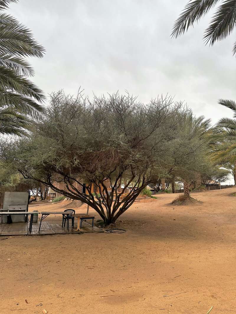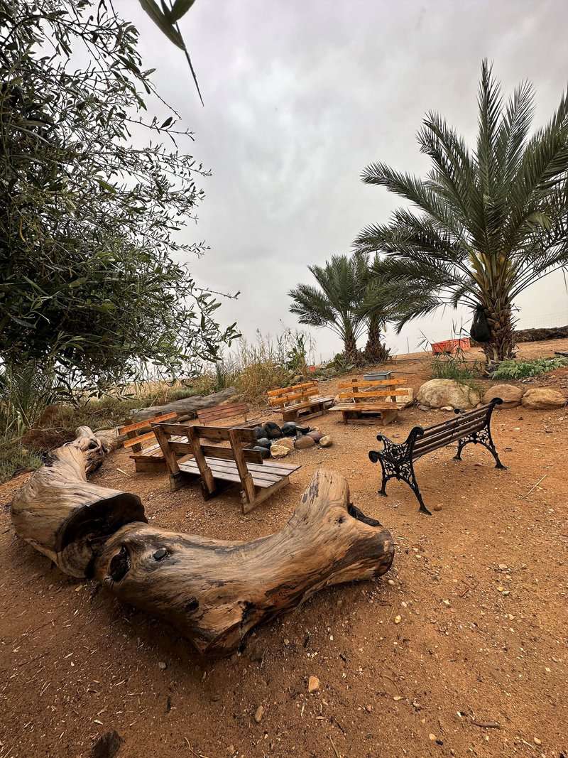 אחרי שתיית התה הערבתי שהוא כמעט וכופה עלי ללגום, אנחנו מסתובבים במקום. גשם שהחל לרדת במקום הופך את האדמה לבוצית מעט. המפגש בין המים לצמחייה ולקרקע החולית נוסך באוויר תחושה של הפתעה וריח אחר, מרענן. בקצה החאן אני מתוודע לפינת ישיבה מקסימה; גזעים, ספסלי עץ, ואפר של מדורה הכלואה בין אבנים וחלוקי נחל. משהו שמזכיר אש-מדורה ופינג'אן מימים של פעם. תעשו עם המראה הזה מה שאתם רוצים.