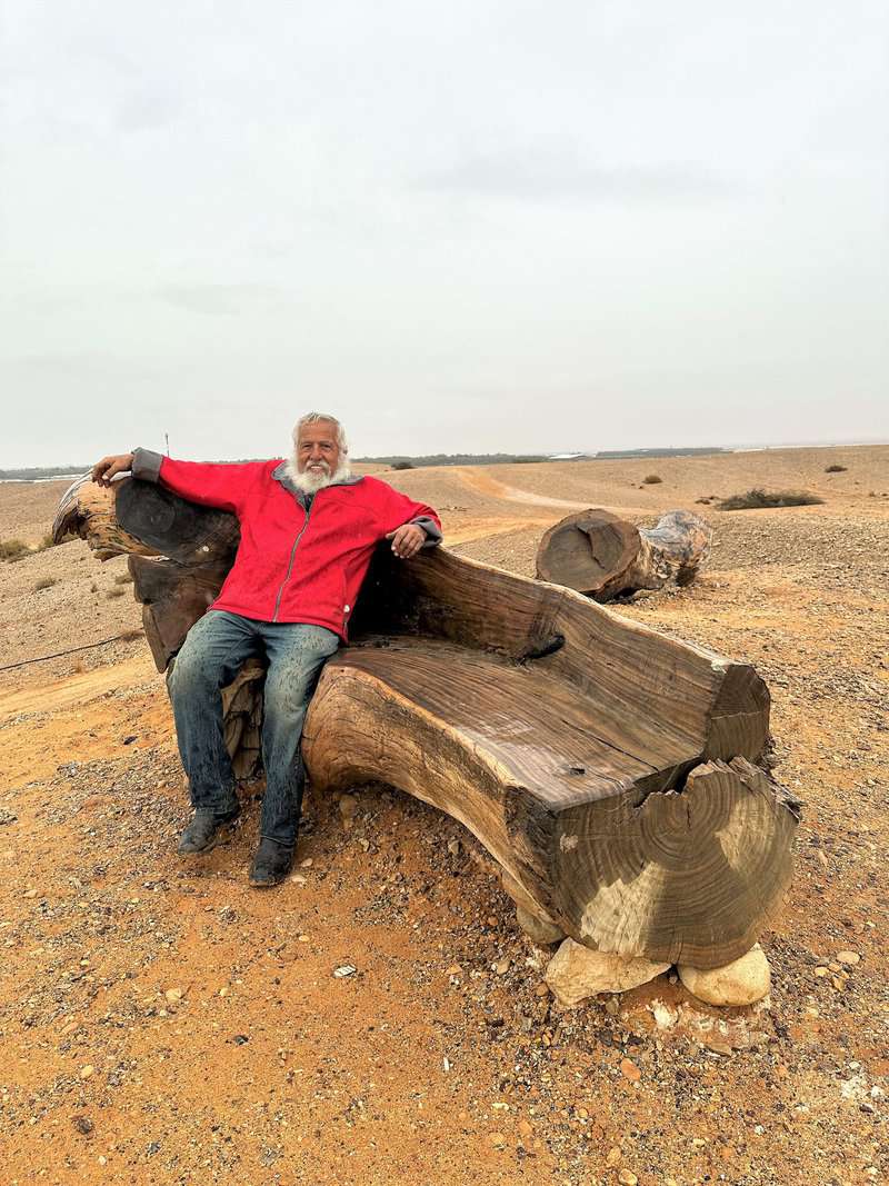 "רגע!" הוא מפציר בי, "לפני שאתה נוסע אני חייב להביא אותך לאיזה מקום". אנחנו הולכים לכיוון הגבעה החולית הקטנה שבסמוך. אני מבחין בכבשה. "מזה? אתה מגדל כאן כבשים מעץ"? איציק נהנה מהמילים ומספר שבנה אותה מגזעי עצים שמצא בסביבה. כאשר מתקרבים אל הכבשה היא הופכת, מקרוב, לספסל.