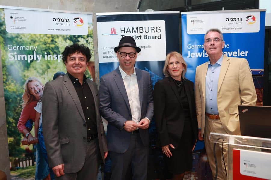 מתוך הכנס של לשכת התיירות הגרמנית בישראל, בו הוכרזה פתיחת הקו החדש: פול סקולדרו (מימין) ושלמה אלמגור (משמאל), בעלי תל אביב אייר, גולדי מולר, מנהל לשכת התיירות הגרמנית בישראל ומיכאל אוטרמבה, מנהל לשכת התיירות של המבורג