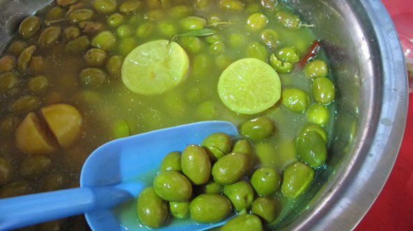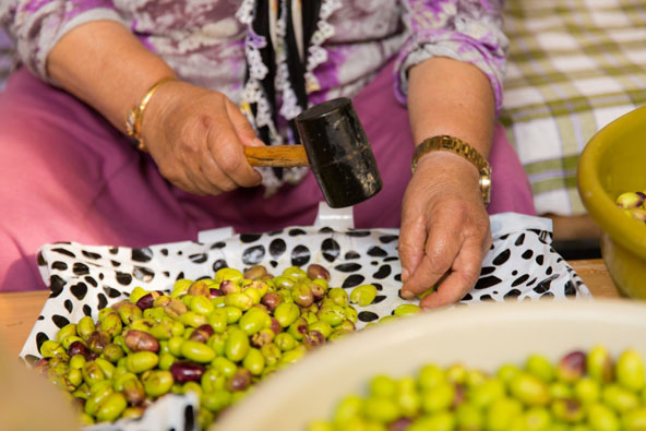 אום מוריס מארחת בביתה לארוחות בסגנון מסורתי. לאחר שניגבנו פיתות טריות בשמן זית ובחומוס, הדגימה כבישת זיתים. היא יושבת לצד שולחן נמוך, שעליו זיתים טריים, לימונים כבושים, עלי דפנה מיובשים ועיסה חריפה. תחילה היא דופקת את הזיתים ומבקעת אותם בפטיש. לאחר מכן מערבבת עם שאר החומרים ודוחסת את התערובת לבקבוקי פלסטיק המיועדים למכירה. את הדרך לבית הבד אל-פלאח, באזור התעשייה של הכפר מע'אר, עושים ברכב הספארי – הטיולית הישנה, שדפנותיה פתוחים לשמש ולרוח, מוכיחה גם בזקנתה יכולת לחצות ואדיות ושדות זרועי אבנים.  כבישת זיתים: כחלק מהתהליך דופקים את הזיתים בפטיש | צילום: סאלח דאקסה