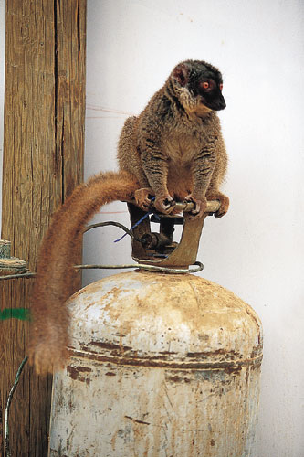 בין לבין, לילך נסעה לקמרון, שם שהתה כמה חודשים כמתנדבת במקלט לגורילות ולשימפנזים, סמוך לעיירה לימבה (Limbe). "מסע אחר" אימץ את המקלט. "אספנו תרומות ובעיקר מוצרים", מספרת לילך. "אני הייתי אחראית על גורילה ועל שני גֶחַנים, שהם בעלי חיים מדהימים. זו היתה חוויה מיוחדת במינה". כשחזרה, החליטו דנדן ולילך שזה מה שהם רוצים לעשות כשיהיו גדולים. להקים מקלט לחיות בר בארץ. כשהגיעו לחווה, שמשתרעת על שטח של 2,700 דונם, לא היה בה דבר כמעט. "אחרי כמה התלבטויות הוחלט על המיקום. לא היה פה כלום, אפילו לא צל, רק חום אימים ואדמה חשופה לגמרי של תחילת הקיץ. זה היה לפני שנתיים. בקרוואן שהבאנו לא היו שירותים, והחשמל מהגנרטור הספיק לשעה אחת ביום", נזכר דנדן. היום הם מקבלים את החשמל מגנרטור גדול (בשיתוף עם משפחת אדירי, השותפים בחווה), והתנאים הם גן עדן לעומת ההתחלה. "כשסיימנו לגדר כמה מכלאות, פתאום התחילו ללילך בחילות. אחרי כמה זמן נולדה אופק". "עד גיל שנה", מספרת לילך, "אופק היתה צמודה אלי. תלינו בחוץ ערסל, שבו היא ישנה כשטיפלתי בחיות. תמיד היה לי ברור שאני לא אהיה אמא היסטרית, וכשאופק היתה בת חצי שנה, לקחנו אותה לגרנלנד לראות דובי קוטב וניבתנים. בדרך כלל כשאני נוסעת זה כדי לראות איזשהו בעל חיים". בהמשך יצאה המשפחה לאי ג'רזי שבתעלה האנגלית, לגיחת השתלמות קצרה בגן החיות  | | למור על מיכל גז. עם גוף קטן וזנב ענקי אפשר להגיע לאן שרוצים |