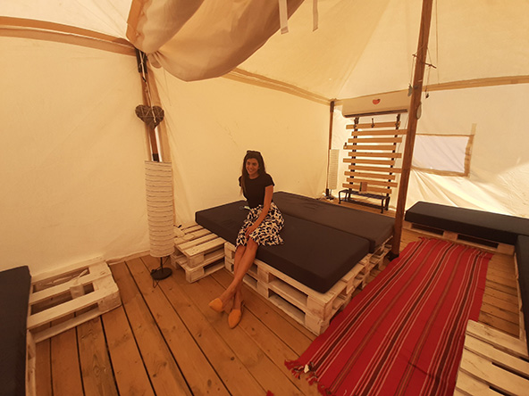 המתחם נולד גם הוא כחלק מאסטרטגיית היציאה מהמשבר שפקד את אילת, ואת כולנו, בחודשים האחרונים. בעתיד הוא אמור לפעול כמלון נודד שיעבור בעוד מקומות בארץ, אבל כרגע הוא ממוקם באילת, צמוד לחוות הגמלים, והוא מכיל אוהלים ממוזגים (עם מזגן חזק באמת) עם מזרנים עבים ונוחים המונחים על גבי משטחי עץ ושטיחים באווירה מדברית. יש אוהלים המתאימים לארבעה ואוהלים לשמונה. מחוץ לאוהלים, האווירה תזכיר לכם את סיני, עם ערסלים ופינות צ'יל נעימות. במתחם יש מטבח משותף עם מקררים, כיורים ועמדות מנגל ומקלחות משותפות (התאים כמובן נפרדים, ויש אפילו תא אחד גדול, עם שני טושים, עבור פעוטות שעוד לא מתקלחים לבד וזקוקים לעזרת הורה). המתחם מתאים לצעירים בגילם וברוחם, למשפחות הרפתקניות, לקבוצות של צוללים או גולשי רוח ולכל מי שמחפש את רוח המדבר, הפיזית והרוחנית.