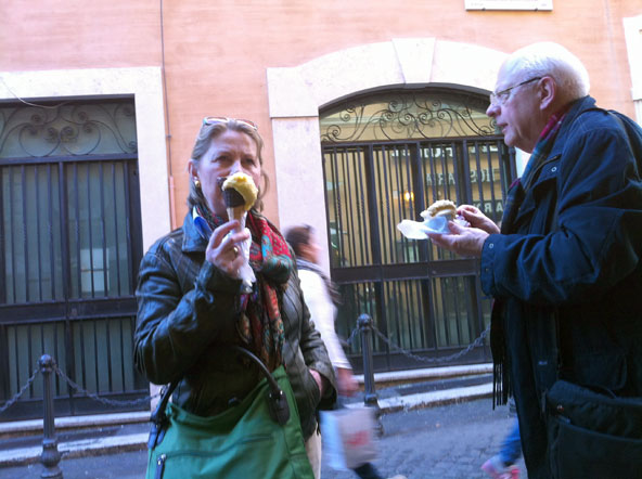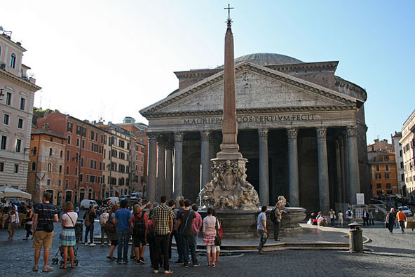 בשעת צהריים המקום מלא בקהל טרנדי שמבלה שעה ארוכה מעל צלחות של פסטה כל כך טובה שבא לבכות מאושר, מלווה ביין הבית הקליל והמצוין. בשולחן השכן אדם מכובד מראה ולבן שיער חיסל מנה אחרי מנה אחרי מנה וקינח בקפה ועוגה (ומיד זכה בפינו לכינוי "מבקר המסעדות" כי אחרת איך אפשר להסביר את הכמות הבלתי הגיונית של אוכל שנעלמה בקרבו?). אנחנו הסתפקנו במנת פסטה – ניוקי קסום עם רוטב של גורגנזולה ומחית אגסים בצד שלי, רביולי חלומיים ברוטב פרחי קישואים ממול. פנים רבות לו לאושר, ופסטה מושלמת היא בפירוש פן אחד.  הגלידה של ג'יולוטי. האמיצים (או אולי הפתיים) יבקשו כף של קצפת ביתית מעל הררי הגלידה מכאן אפשר לדדות בבטן מלאה ורגליים כושלות לרחוב הסמוך, לגלידריית ג'יולוטי (Giolitti, כתובת: Via Uffici del Vicario 46) שעצם התור הארוך המשתרך לפני מקרר הגלידות מעיד על הפופולריות שלה. אם, כמוני, איבדתם לרגע את העשתונות, הנידו הן כשהמוכר שואל אתכם אם להוסיף קצפת. קצפת דחוסה, עוצמתית וביתית לגמרי נחתה על שני כדורים ענקיים של גלידה (מוס שוקולד ונוגט, למקרה שתהיתם) ועשתה את המלאכה. בכוחותיי האחרונים זחלתי אל הפנתיאון, הנמצא בקרבת מקום, לעוד קצת הוד והדר לפני שקרסתי סופית באחת המוניות הממתינות תמיד לצדו.