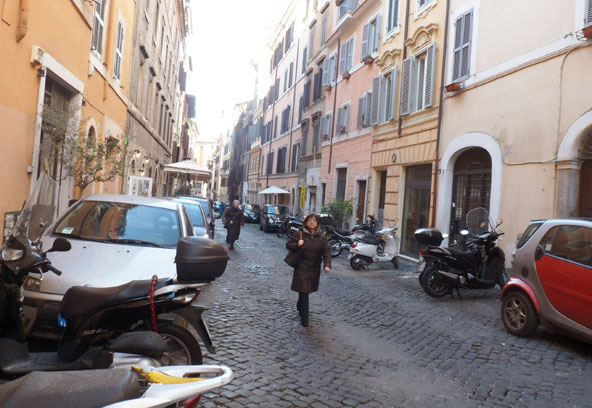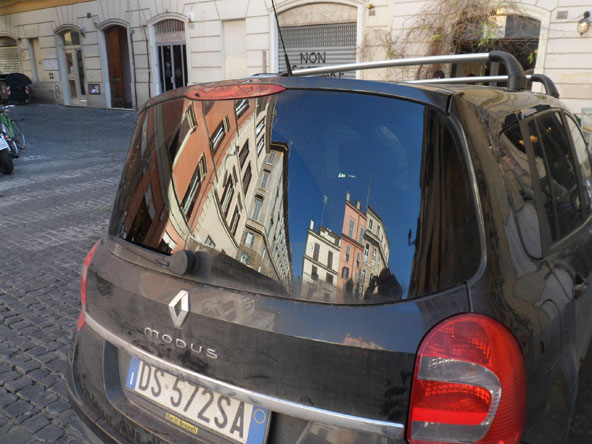 שכונת מונטי אינה גדולה ואפשר לטייל בסמטאותיה בנחת מבלי מטרה מסוימת. אם תרצו לבקר באתרים מפורסמים, גם אלה לא חסרים פה. בלב השכונה, ברחוב Via della Madonna dei Monti 41 כדאי להציץ לכנסיית סנטה מריה די מונטי, שמתהדרת במזבח מפואר מוקף בציורי קיר מרשימים. כאן גם גיליתי שהקדמה הגיעה ללב הקתוליות הרומית: את מקומם של הנרות המסורתיים, שהמאמינים נוהגים להדליק בתמורה לתרומה קטנה, תפסו נרות חשמליים, שדי בלחיצת מתג כדי להדליקם (ובאותה קלות ניתן לכבות אותם לטובת המאמין הבא שחפץ להרים תרומה ולבקש משאלה). פנייה קטנה ימינה מובילה לכיכר נאה, פיאצה דלה מדונה דה מונטי. קבוצה של תלמידי בית ספר יסודי ישבה על מדרגות המזרקה וציירה במרץ את הבניינים מסביב. המורה עברה בין התלמידים, העירה פה, עודדה שם. כשאחד מהם, זאטוט כבן עשר, הבחין בי הוא מיהר לרשום משהו על הדף שלו והרים אותו בפני: 2 אירו כתב בפינה.  בתים בשכונת מונטי משתקפים בחלון אחורי של מכונית (דווקא מתוצרת צרפת…)
